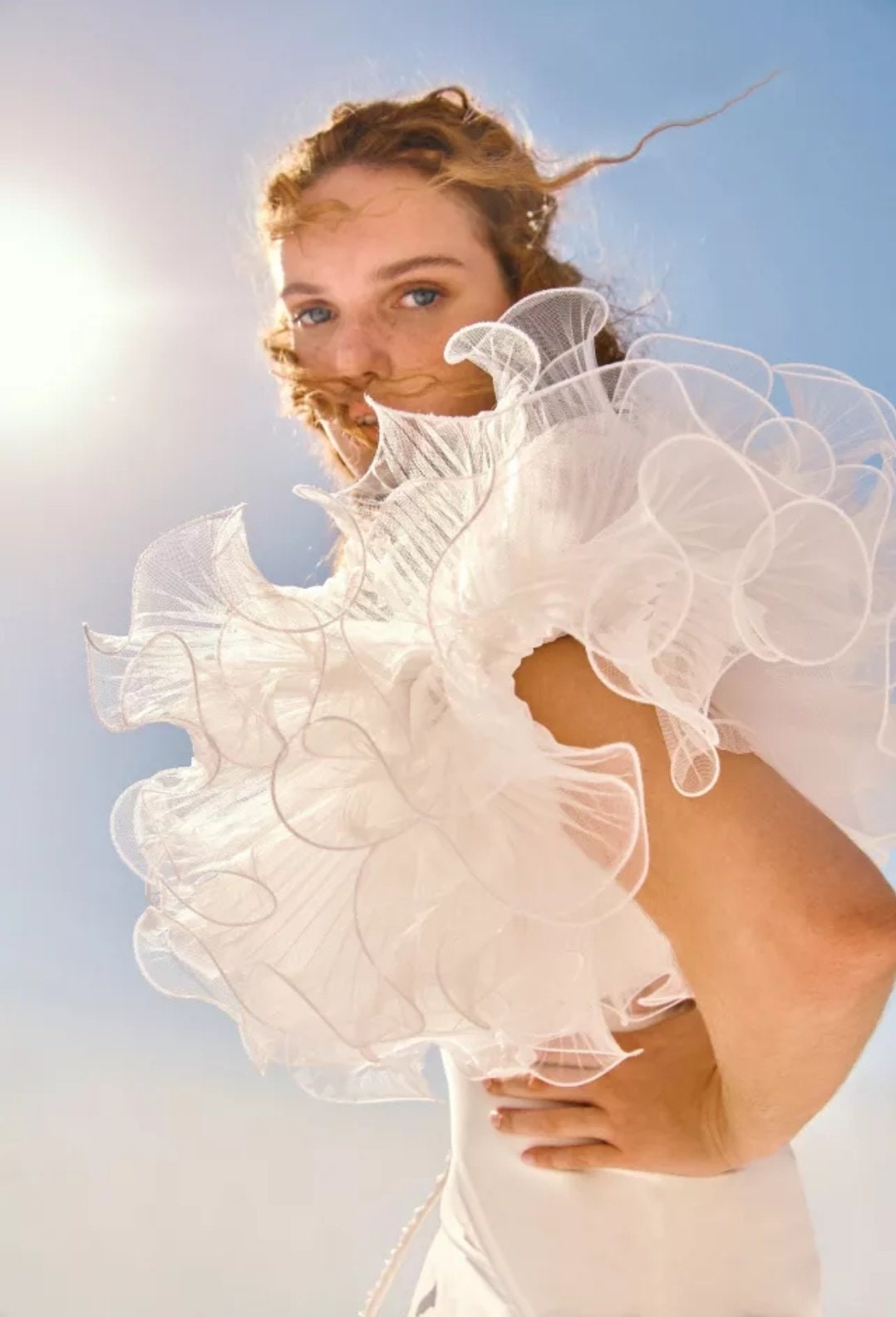 Bardot Frill Hand Beaded Crepe Pleated Tulle Detached Bridal Sleeves.