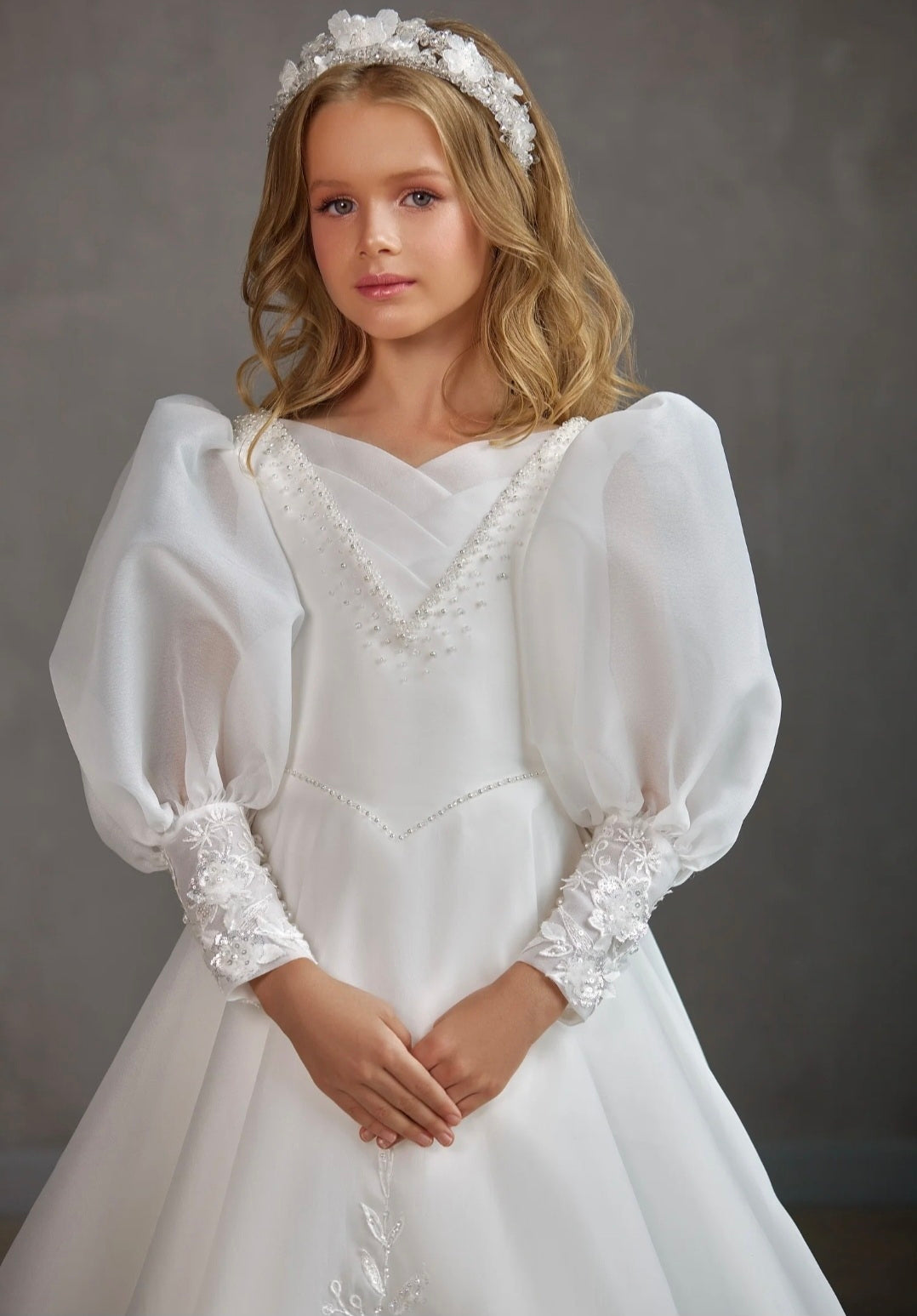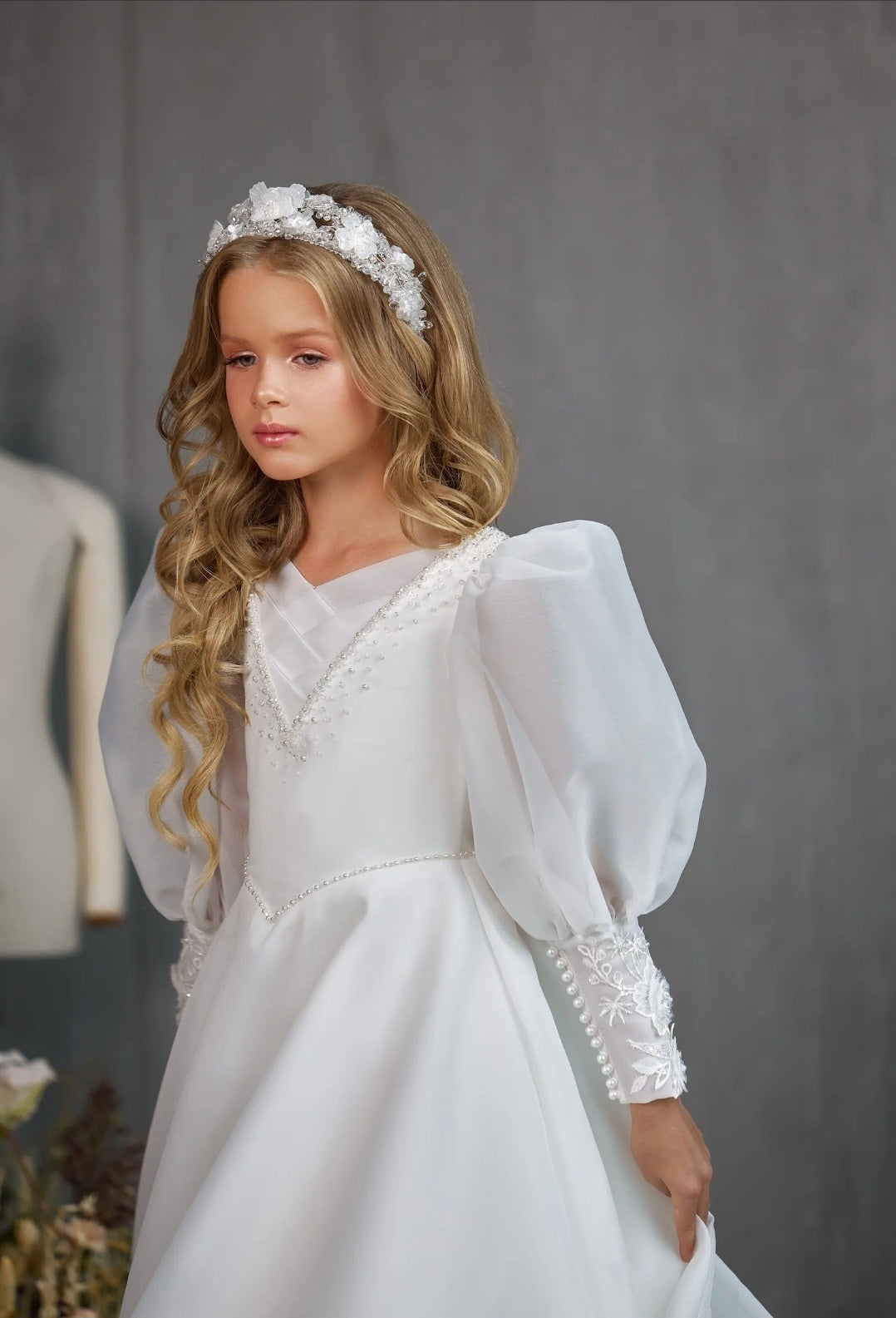 Beautiful And Elegance A-Line Long Sleeve Floral Lace Pearl Beaded Detail Flower/Communion Gown.