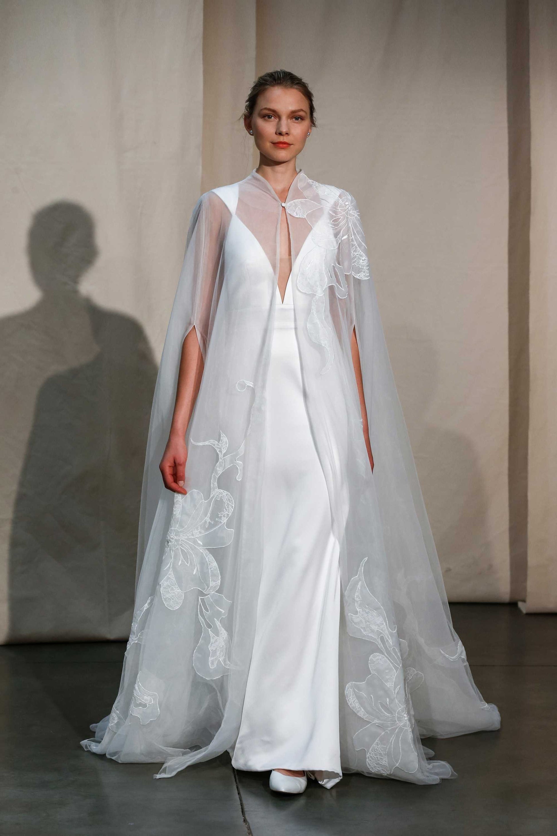 Bold Flower Sheer Bicep Split Button Neck Enclosure Floor Length Bridal Cape