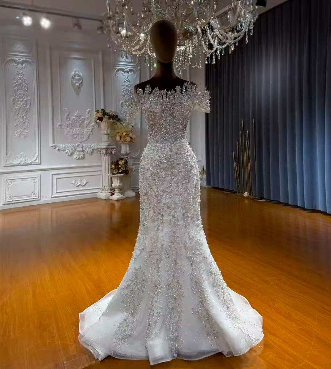 Captivating And Absolutely Stunning Ivory Beaded Crystal Sweetheart Off The Shoulder Trumpet Gown With A-Line Detached Train Skirt.