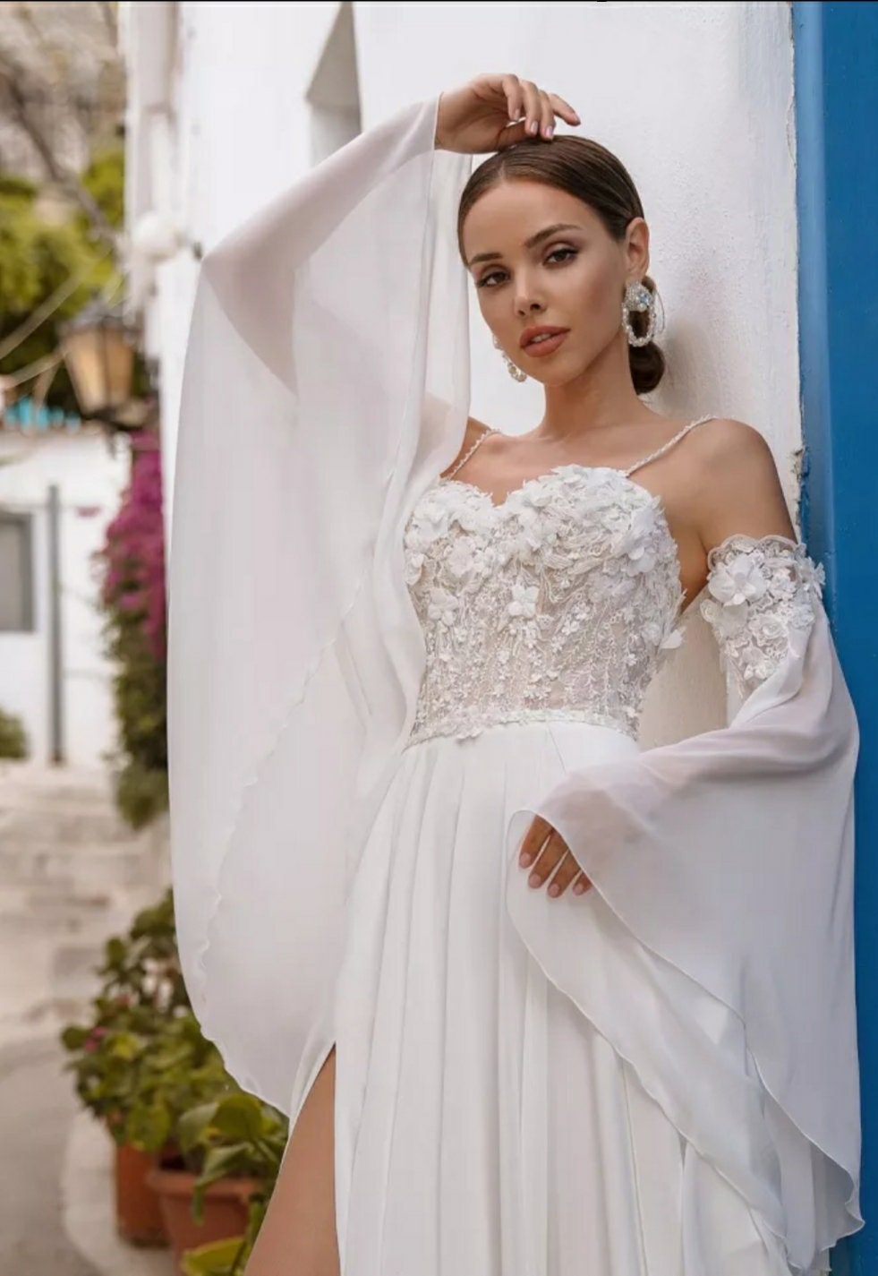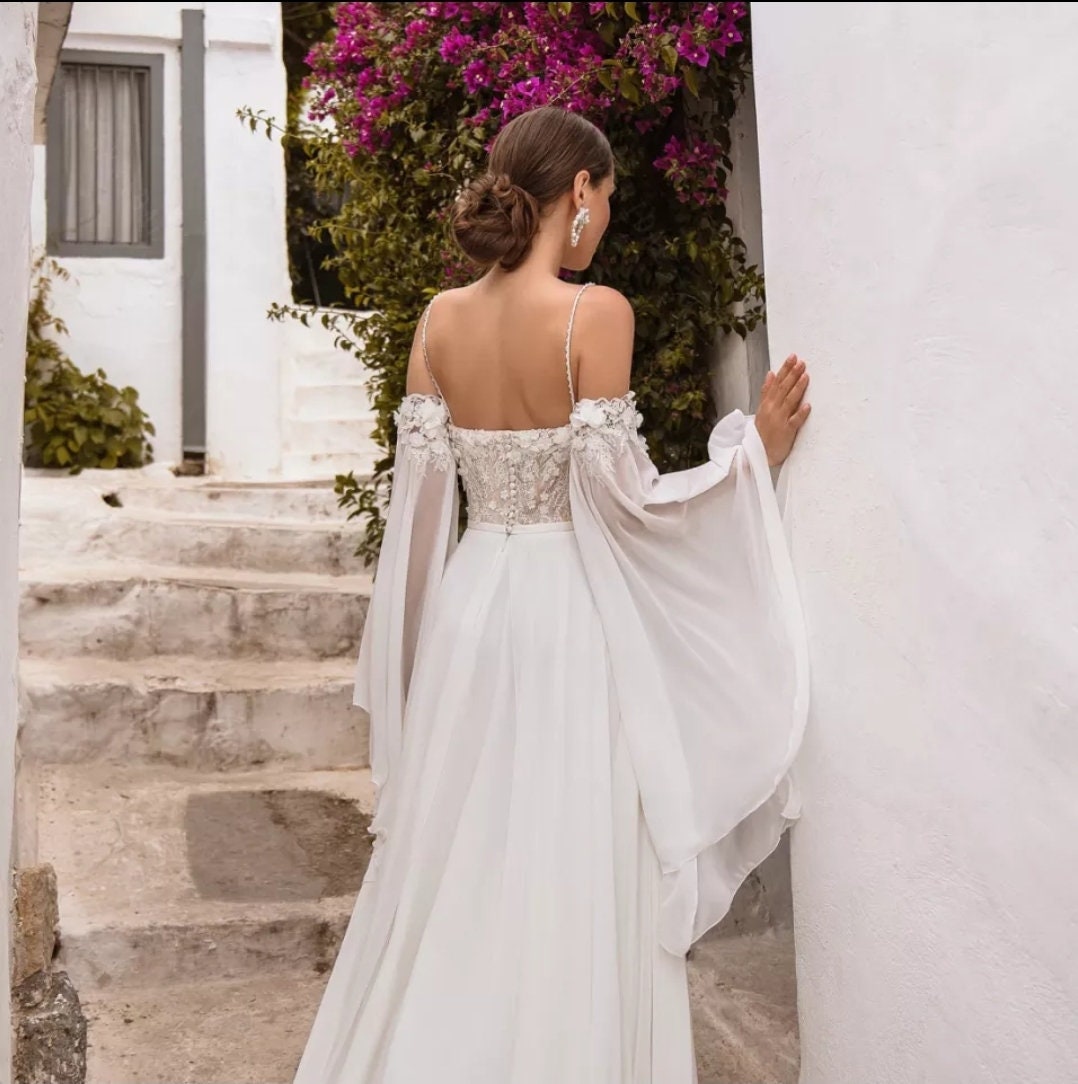 Chiffon 3D Flowers & Lace Appliqués Detached Flared Sleeves