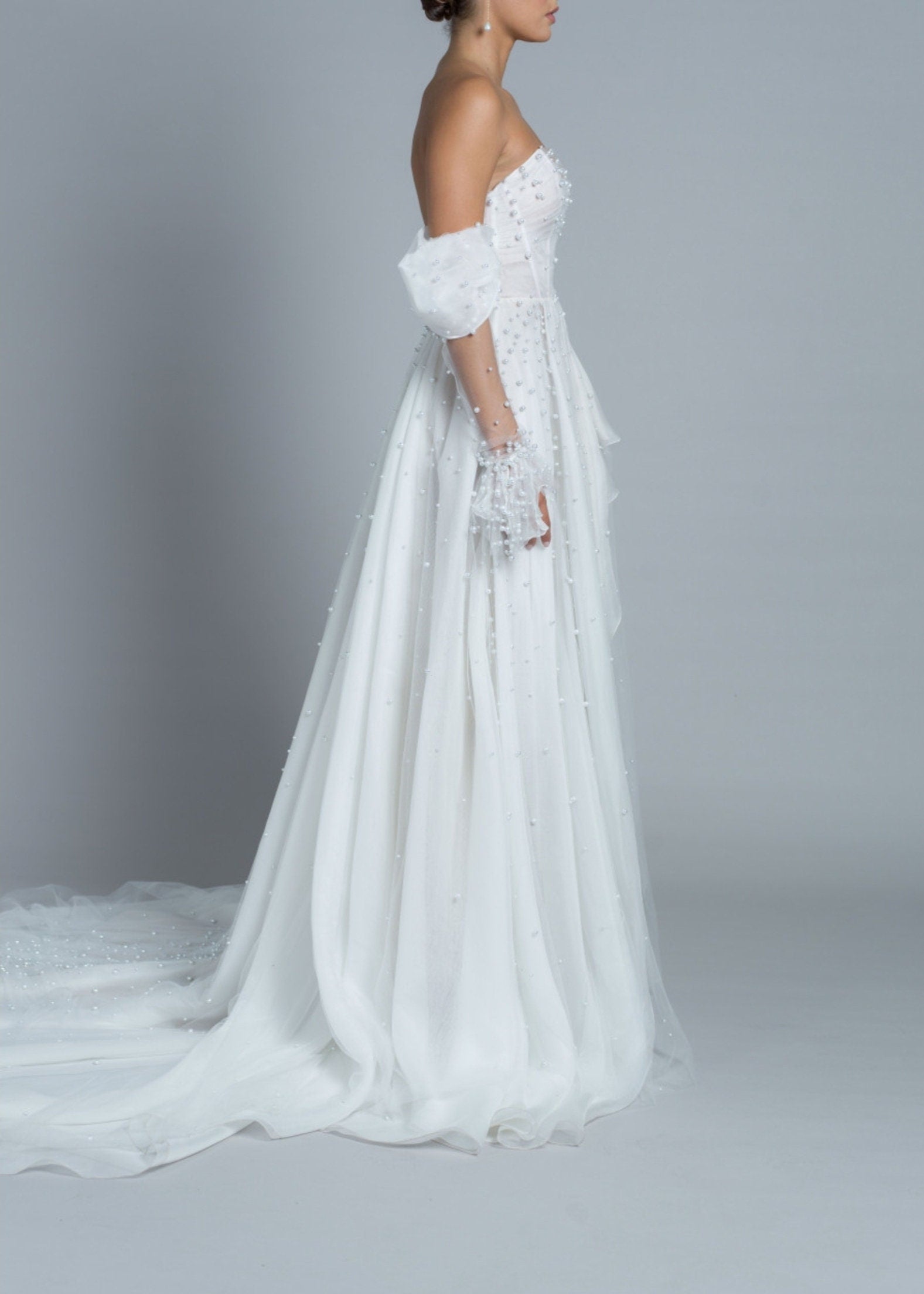 Detached 3/4 Elegant Pearl Beaded Sheer Draped Sleeves.