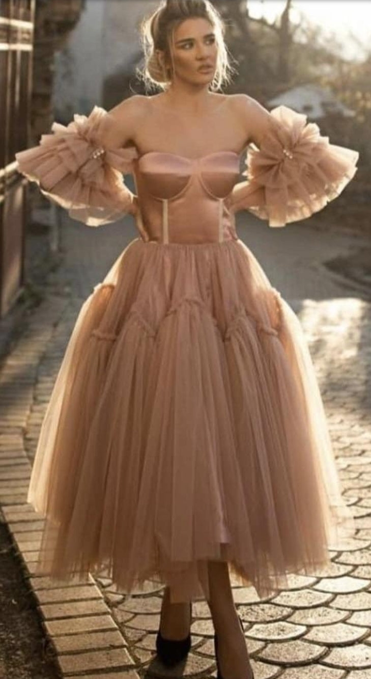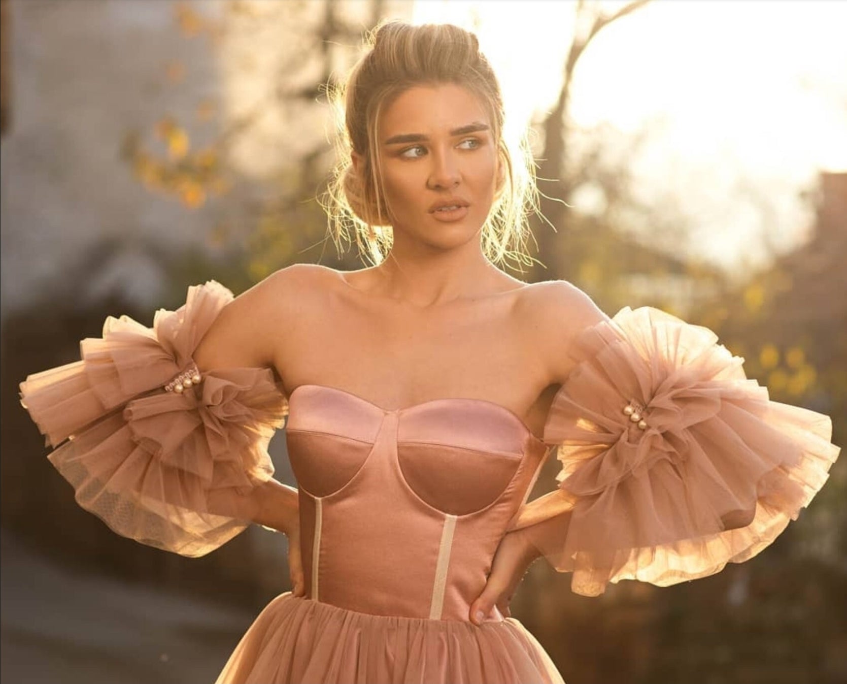 Detached Bardot Pearl Beaded & Gathered Frill Sleeves.