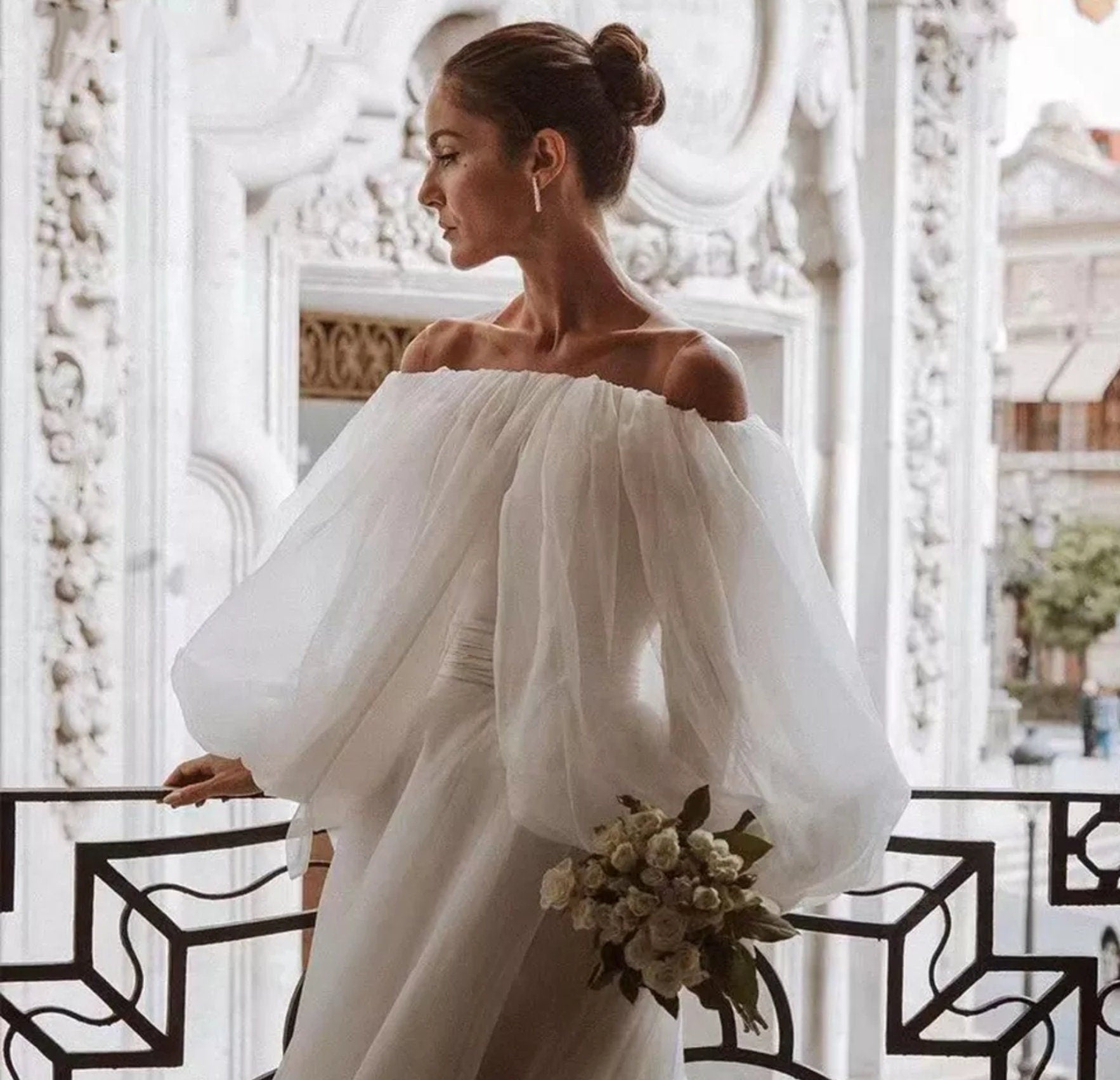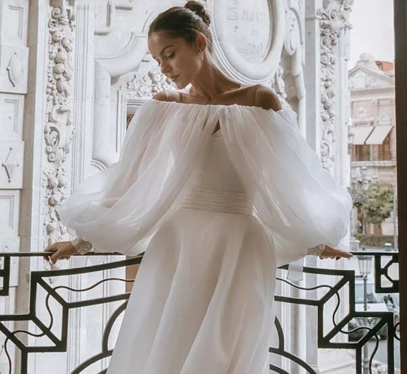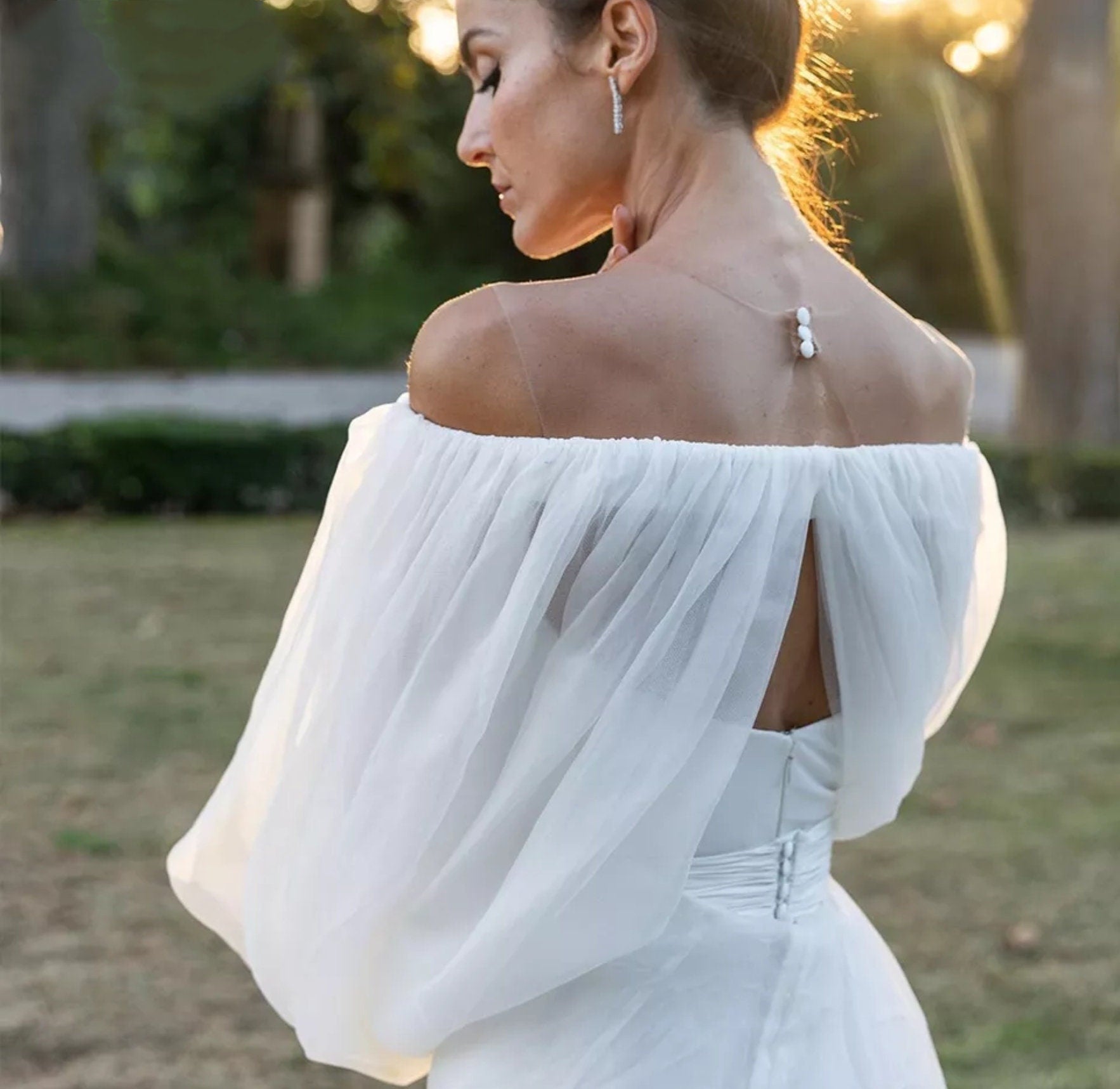 Detached Chiffon Boat Neck Puff Bolero Sleeves.