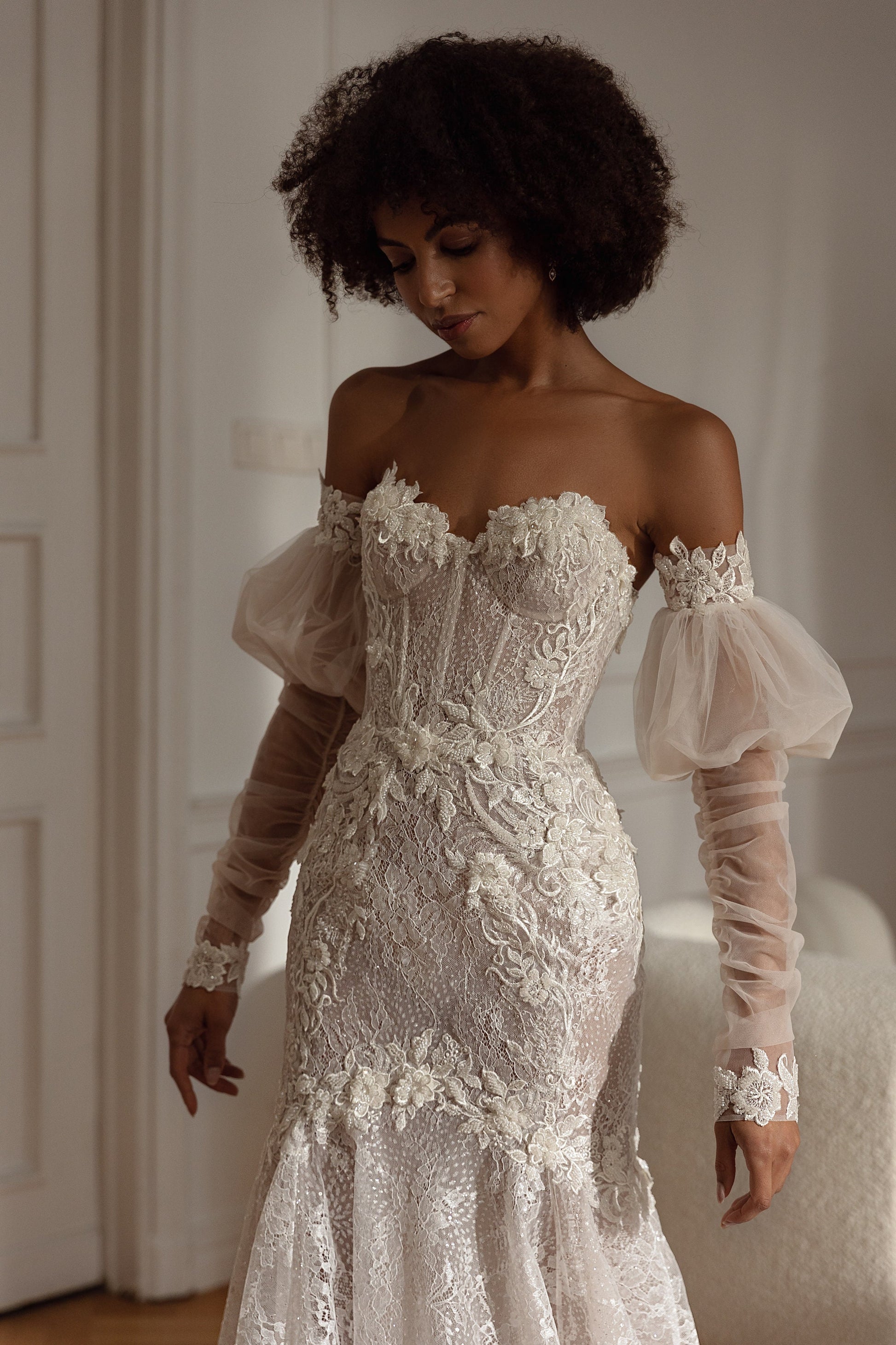 Detached Floral Sequined Embroidered Appliqué Bicep & Wrist Tulle Sleeves.