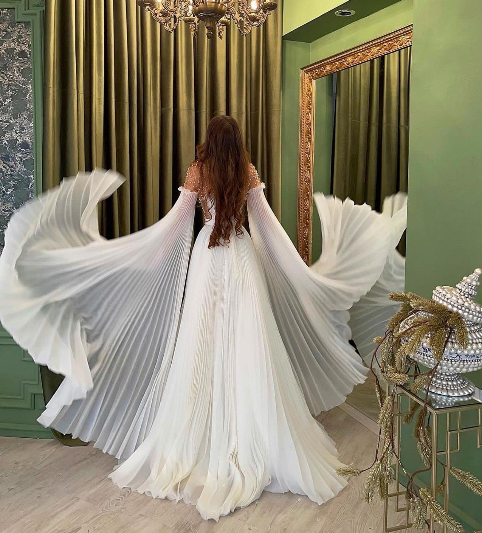 Detached Pleated Bicep Floor Length Trailing Satin Sleeves.
