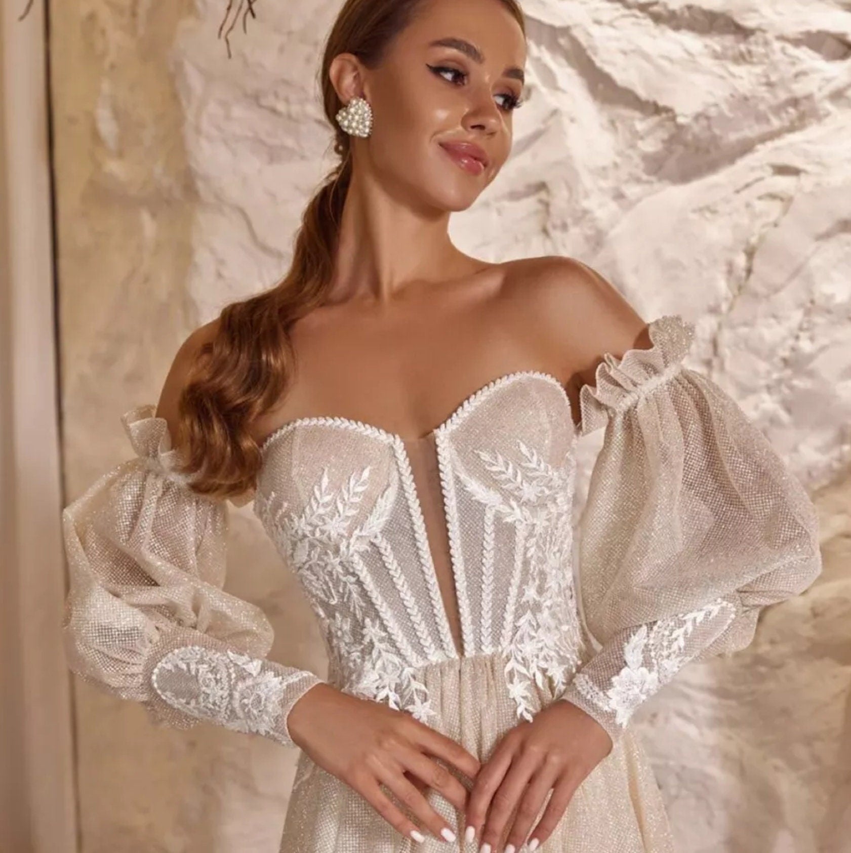 Detached Ruffled Bicep Victorian Appliqué Shimmer Sleeves.