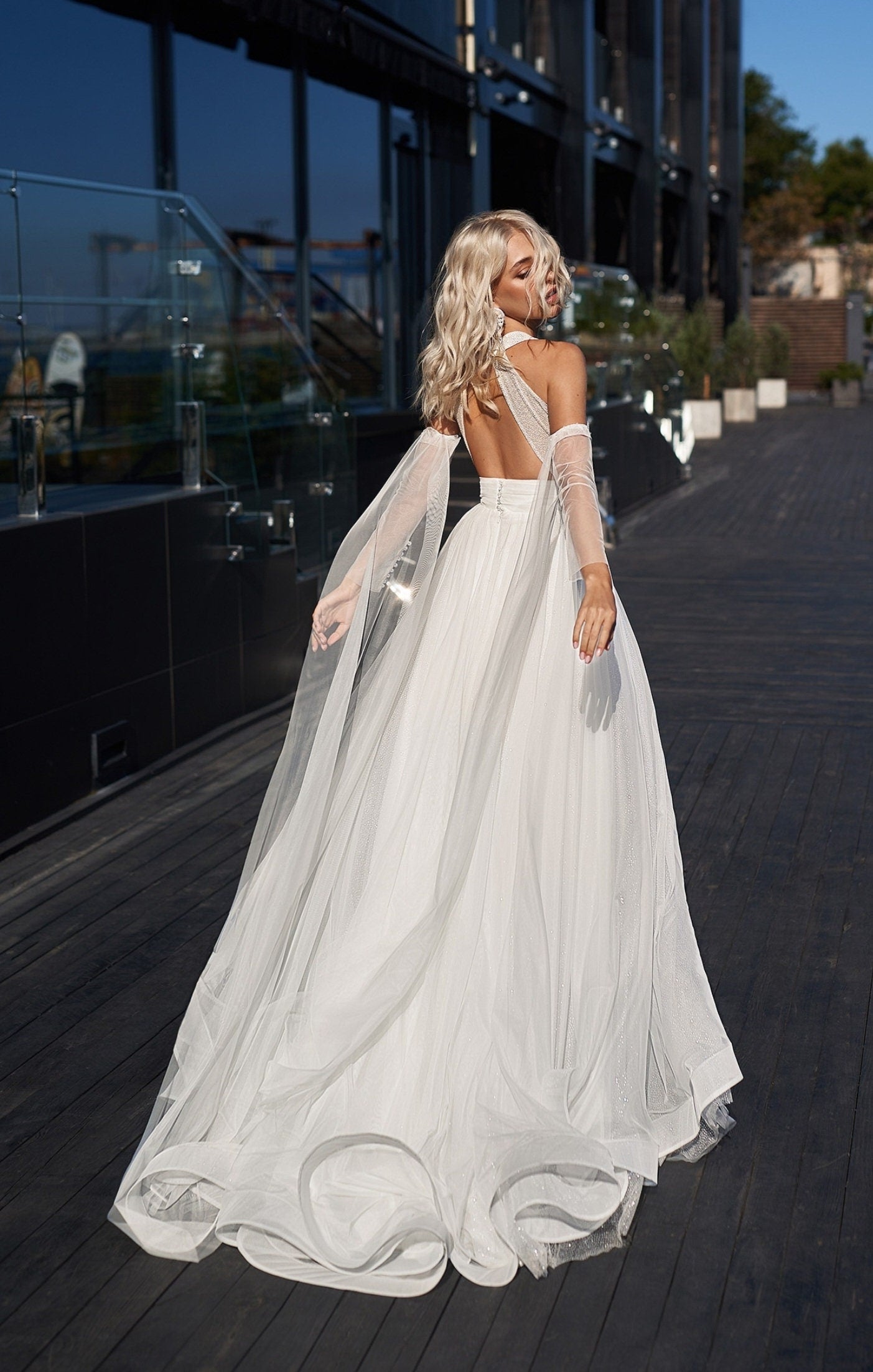 Detached Sheer Pearl Beaded Bicep Long Trailing Sleeves.