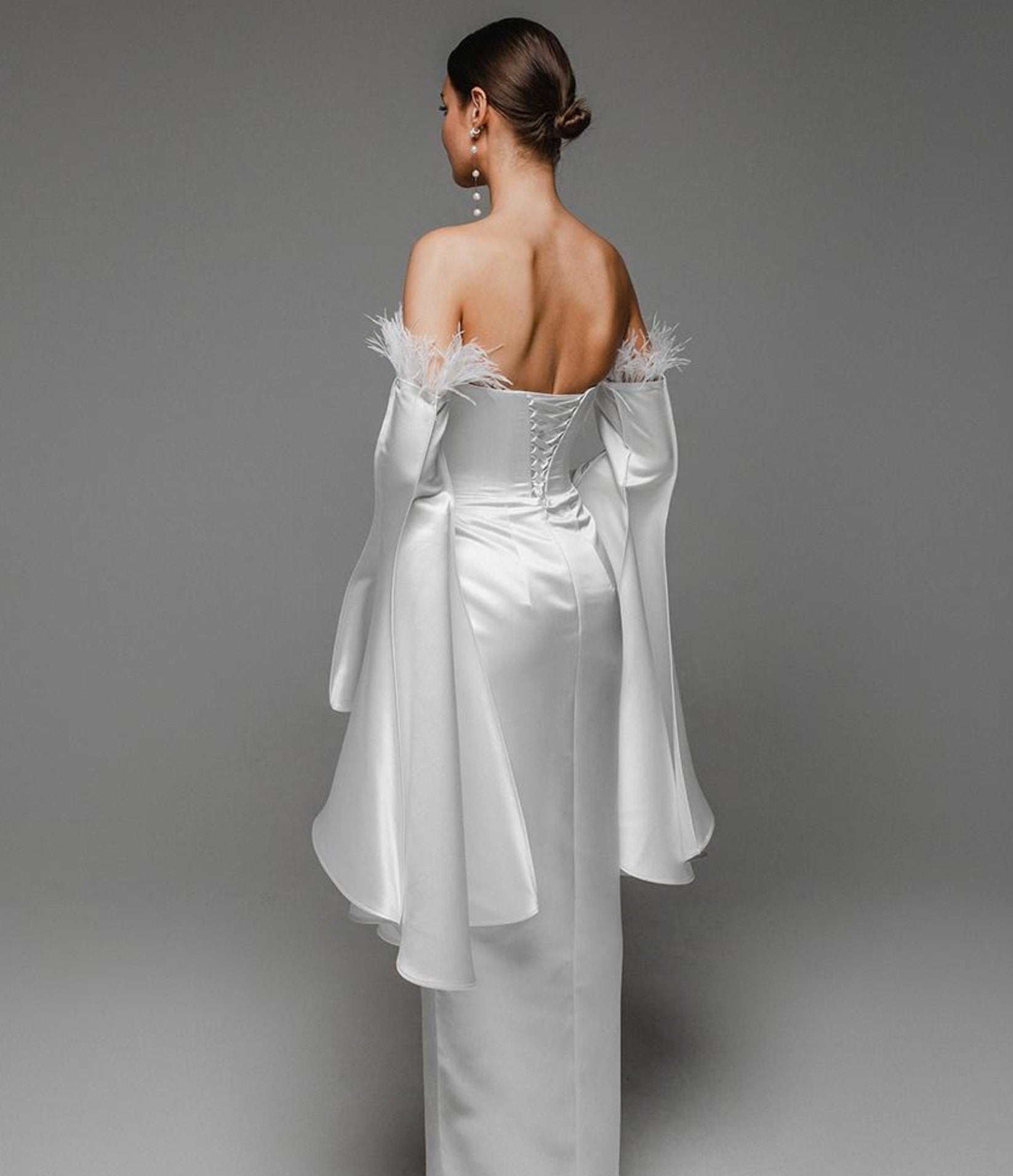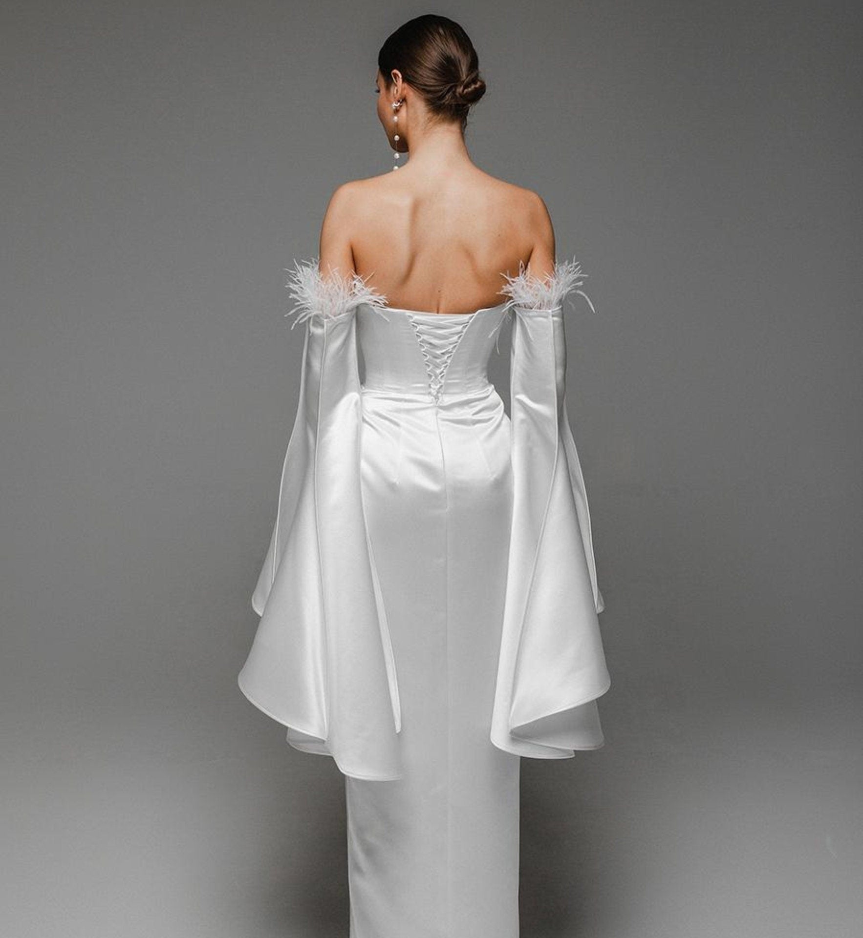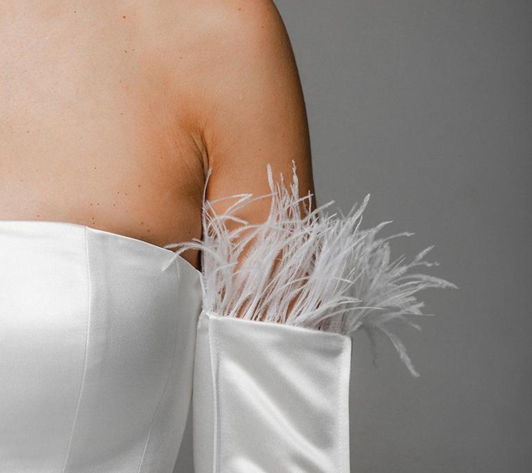Detached Waterfall Asymmetric Cascading Feathered Bicep Sleeves.