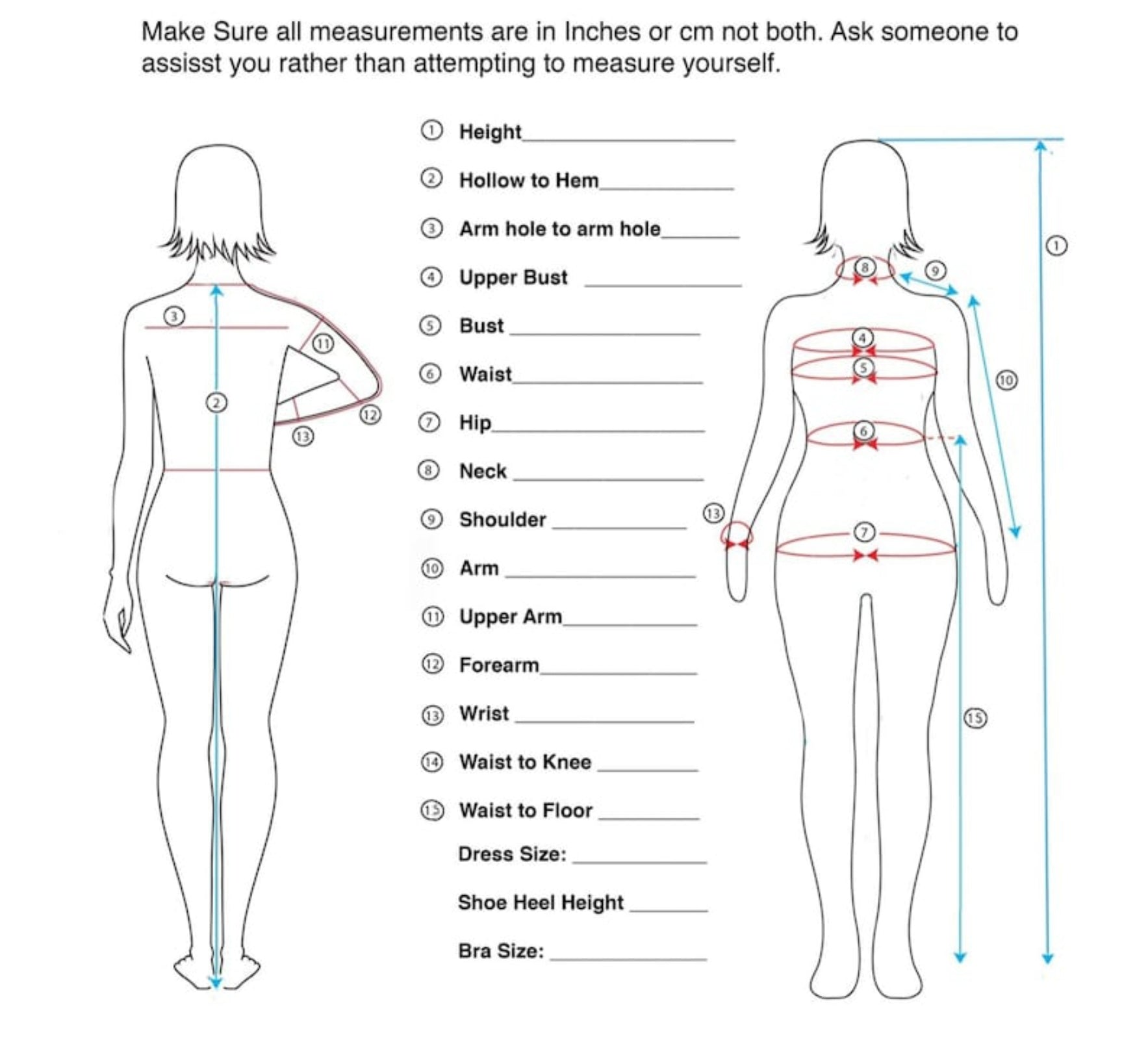 Please be sure to do this correctly. The shop will not be at fault for incorrect information given by customer. If you are not positive on how to do your measurements correctly, please see a seamstress for help.