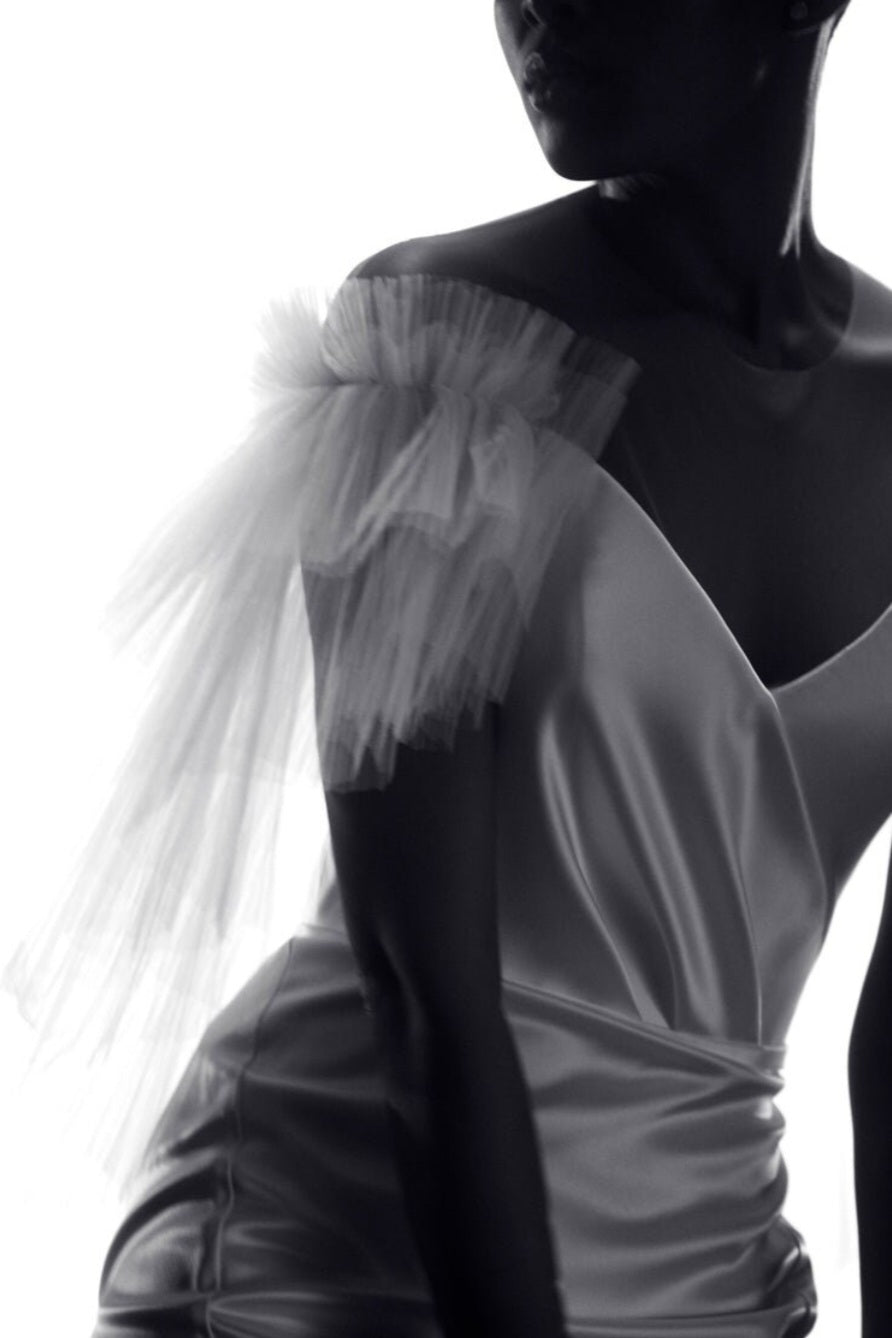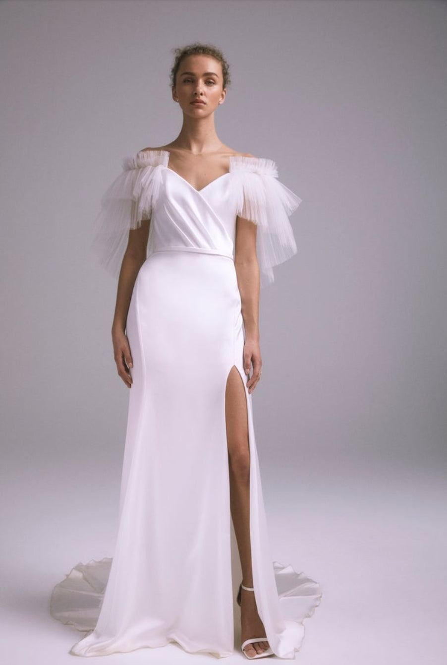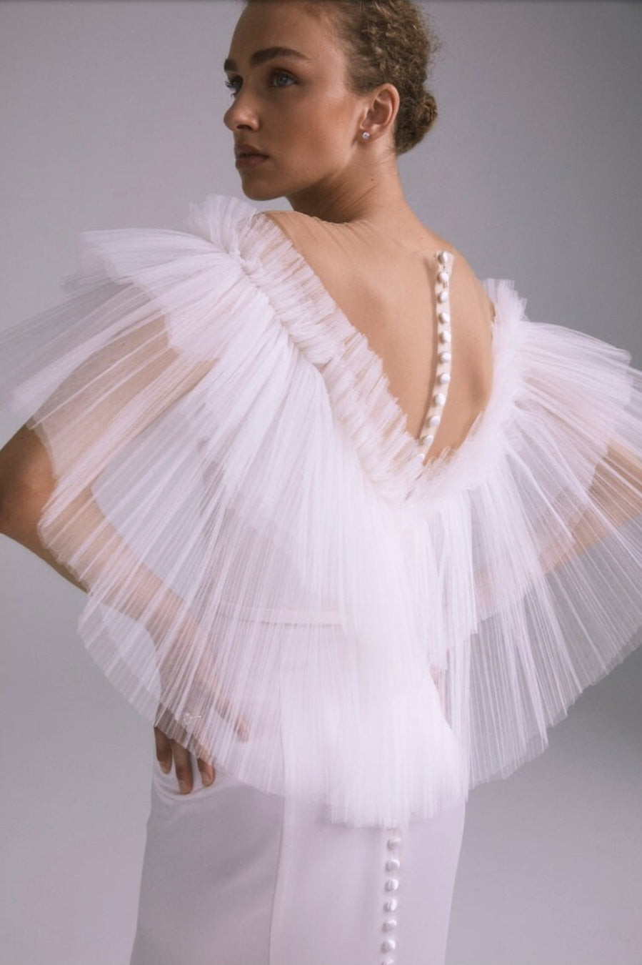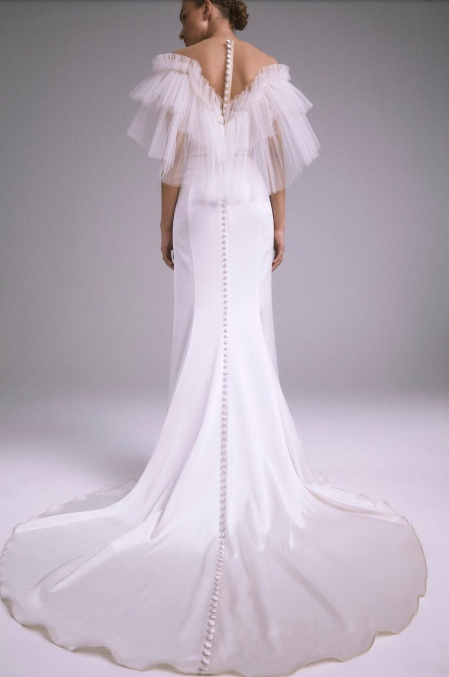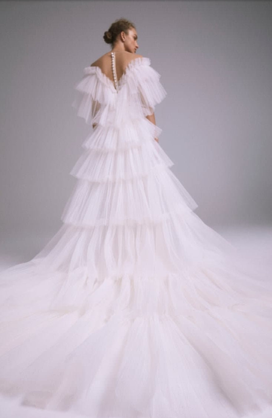 Layered Frill Off The Shoulder Pleated V Neck Sheath Gown With Detached Layered Tulle Train.