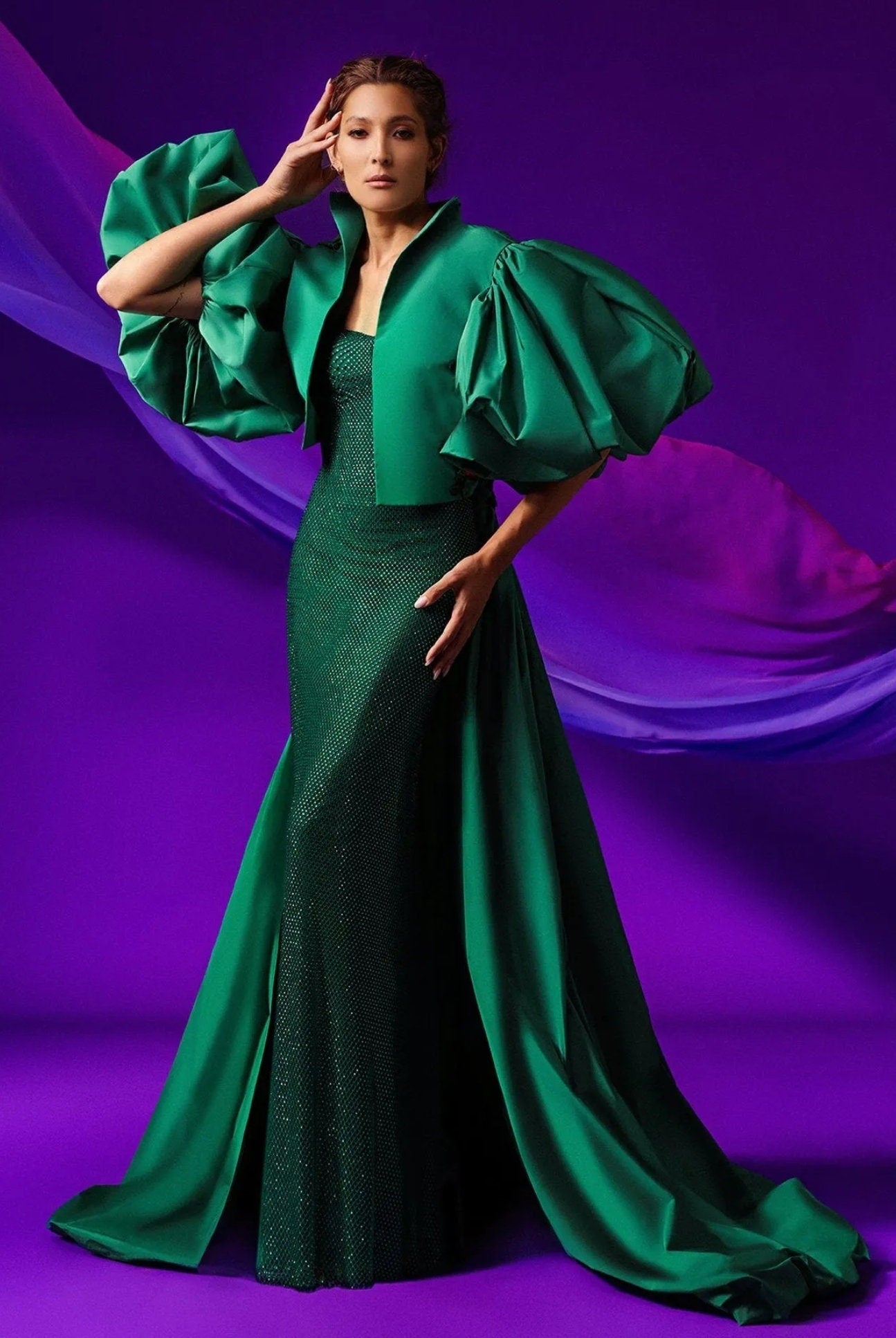 Oversized Dramatic Mikado Puff Sleeve Cinched Back Floor Length Cape.