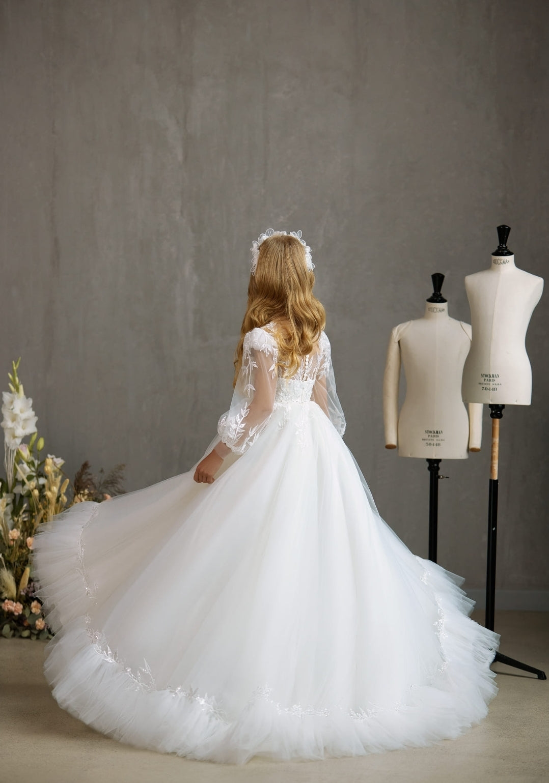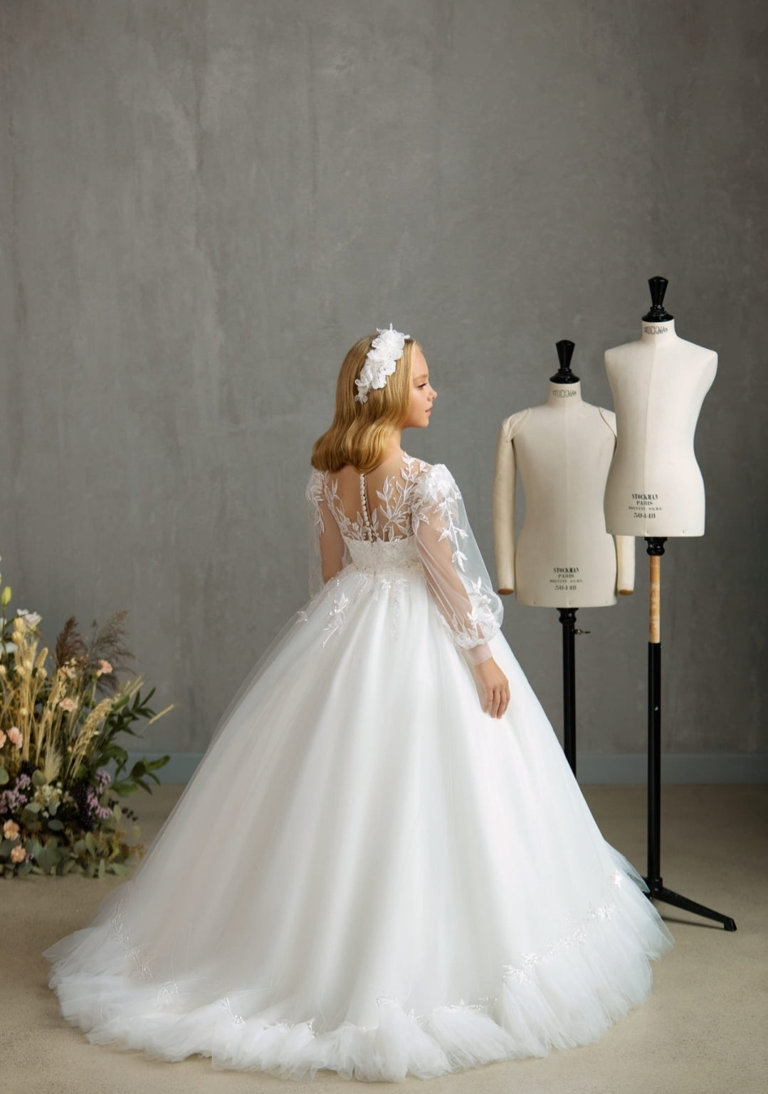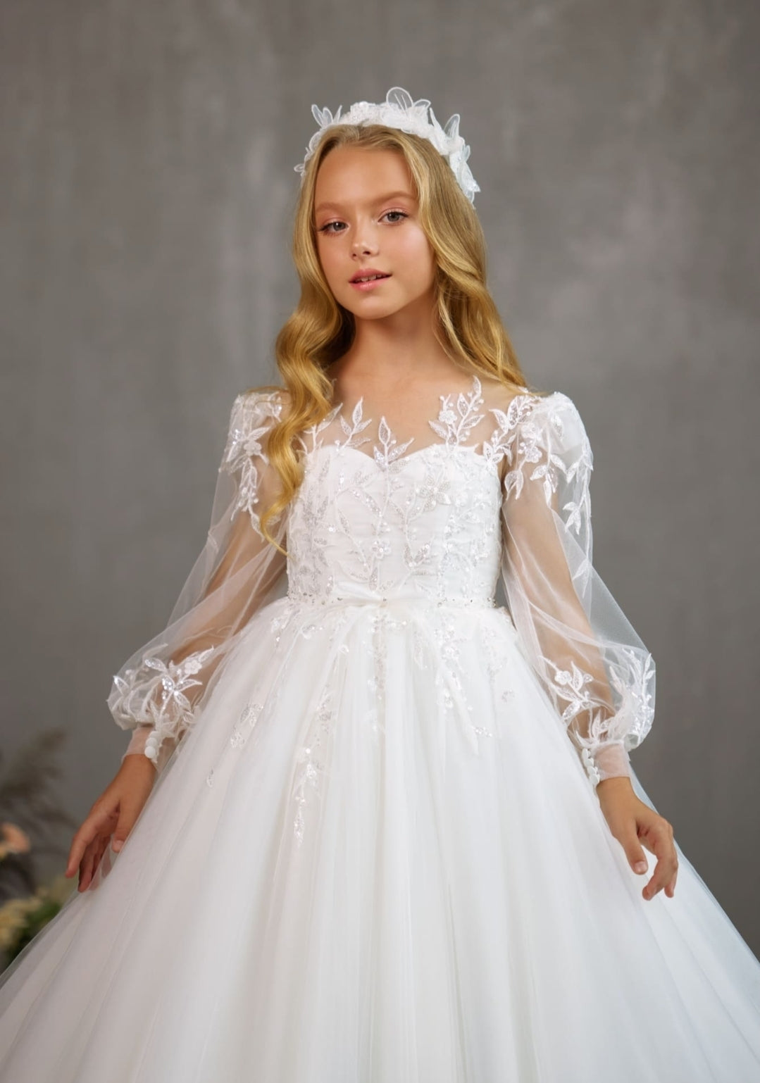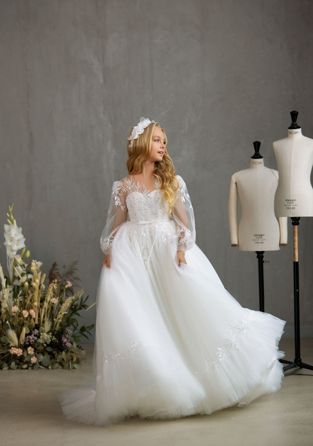Sequinned Floral Lace Sheer Long Sleeve A-Line Flower Girl/Communion Gown.