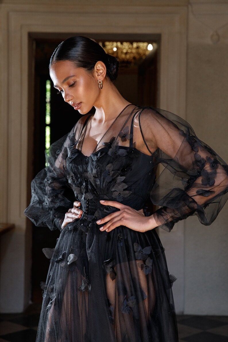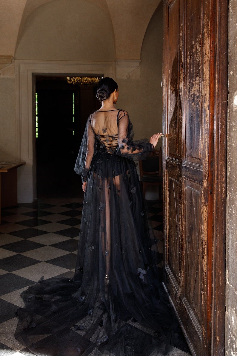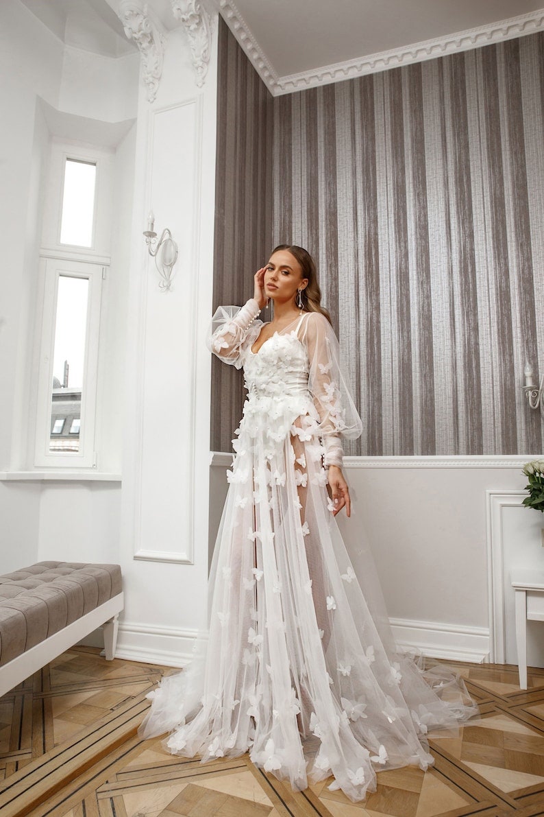 Sheer Sexy Long Sleeve Pearl Beaded Butterfly Boudoir Bridal Photoshoot Robe.