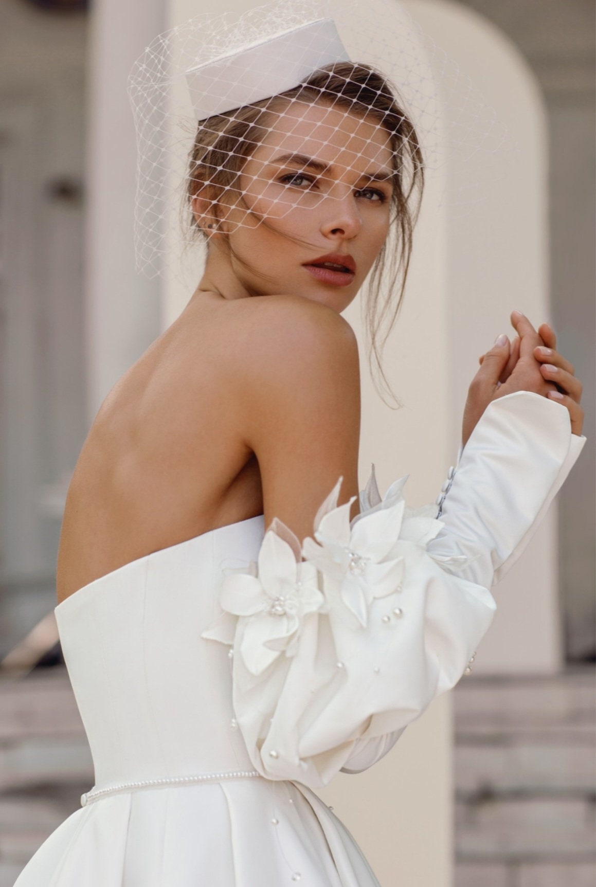 Sophisticated Beaded Pearl 3D Floral Victorian Style Detached Satin Sleeves.